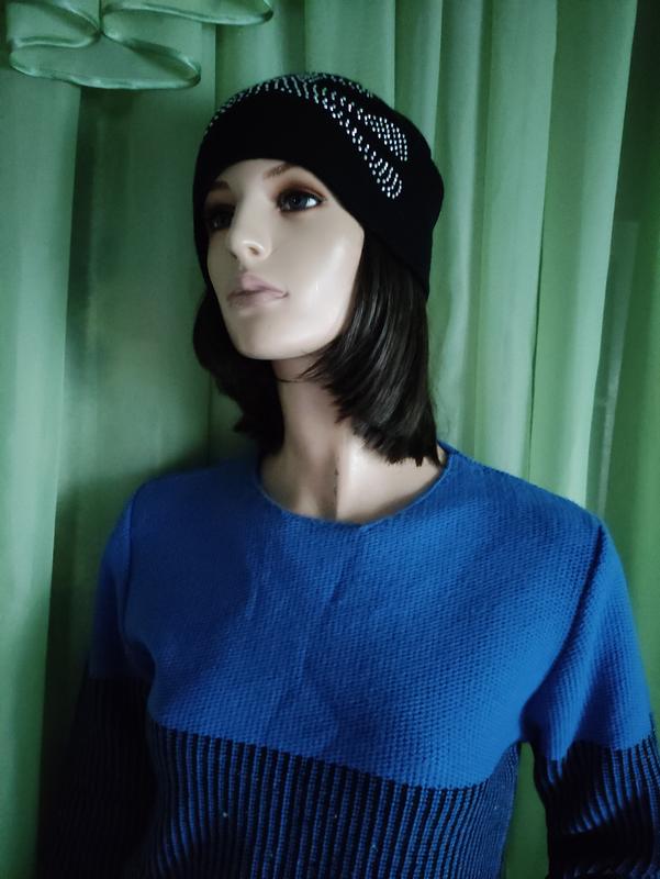 Шапка женская зимняя двойная (Польша), акрил, черного цвета, украшенная аппликацией " череп", one size.