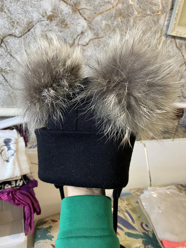 Пампони знімаються на кнопках.Хутро єнота.Тепла зимова шапка.по виробу шапка на голівку до 44 см
