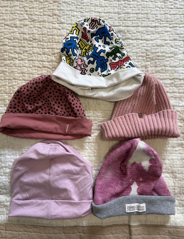 По 1 фото зліва направо 1. Шапка Reserved Розмір 9-13 років З принтом keith haring Трошки тягнеться Ширина 25 Довжина 22 Тепла осінь, весна 100 грн 2. Шапка Reserved Розмір 6-9 років Темно-рожевий в цяточку На літо, теплу весну, осінь Ширина 24, довжина 18 см Трошки тягнеться 80 грн 3. Шапка Next Розмір 7-10 років Колір блідо-рожевий Холодний демісезон Тягнеться дуже добре Довжина 23 см, ширина 22 см 100 грн 4. Шапка Little hippie Тонка, ніжна, подвійна Тепла осінь, весна Ширина 23 см; довжина 24 см На 7-10 років Колір рожево-бузковий 90 грн 5. шапка Dembo House Подвійна, двостороння Зверху рожевий з білим, всередині сірий Тягнеться Теплий демісезон Розмір 7-11 років Довжина 24, ширина 22 см 100 грн
