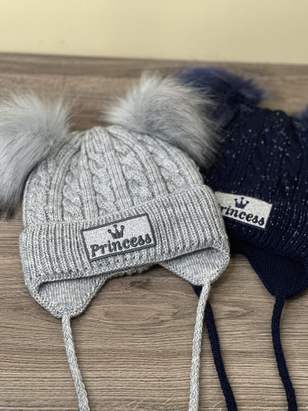 Зимова шапочка з помпонами. на з’язках. сіра та синя