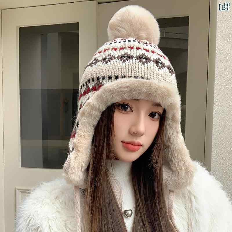 Шапка с ушками зимняя вязаная с орнаментом и помпоном бежевая с узором