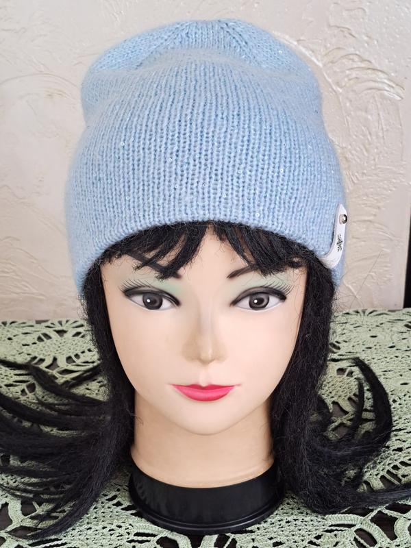 Теплая двойная шапочка бини, голубого цвета. Пряжа: меринос, кид мохер, микропаетки. Размер 54-56. Цена 550 грн.
