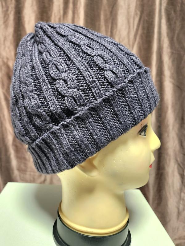 Женская теплая вязаная шапка серого цвета. Машинная вязка. 100% полиэстер. Подкладка - искусственный мех. Манжет подворачивается. Тянется. Размер по изнаночной стороне: мех- 19 см высота, 20 см ширина. Шапка 24 см высота сзади подвернутым манжетом. Размер шапки по лицевой стороне: высота 23 см с подвернутым манжетом, 28 см с отвернутым манжетом, ширина 18 см. Дирок, пятен, затяжек нет.