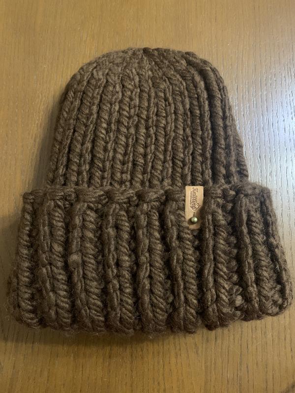 Тепла шапка на зиму, крупна вʼязка, з підворотом, актуальний шоколадний колір, гарно тягнеться Заміри на фото