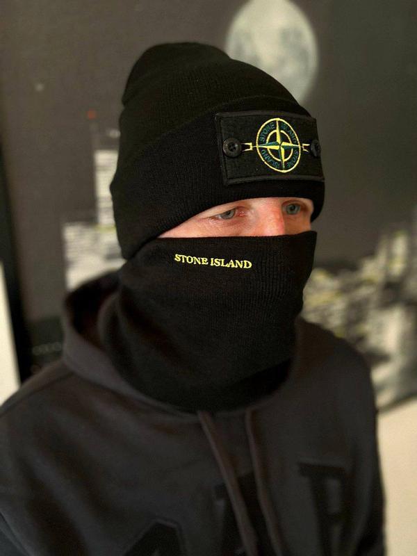 Чоловіча шапка та баф stone island зимова чорна універсальний розмір набір стон айленд чор...