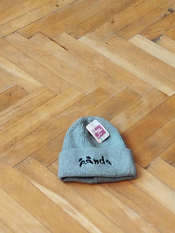 Фото 1 - шапка серого цвета, с заворотом, с рисунком панда, вязка достаточно толстая, не двойная, без подкладки, стоимость 150 грн. Фото 2 - шапка темно зеленого цвета, без надписей и рисунков, вязка тоньше фото 1, без подкладки, стоимость 70 грн. Обе шапки с бирками, материал изделий полистер, на подростков или детей.