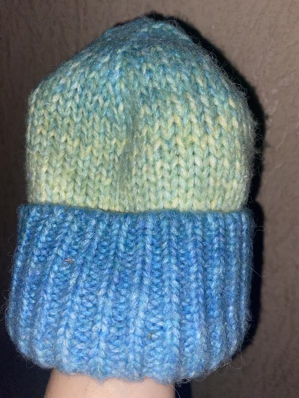 Шапка с переходом цвета в отличном состоянии из крупной вязки . Состав- смешаный - есть бирка.- акрил, полиэстер, полиамид.