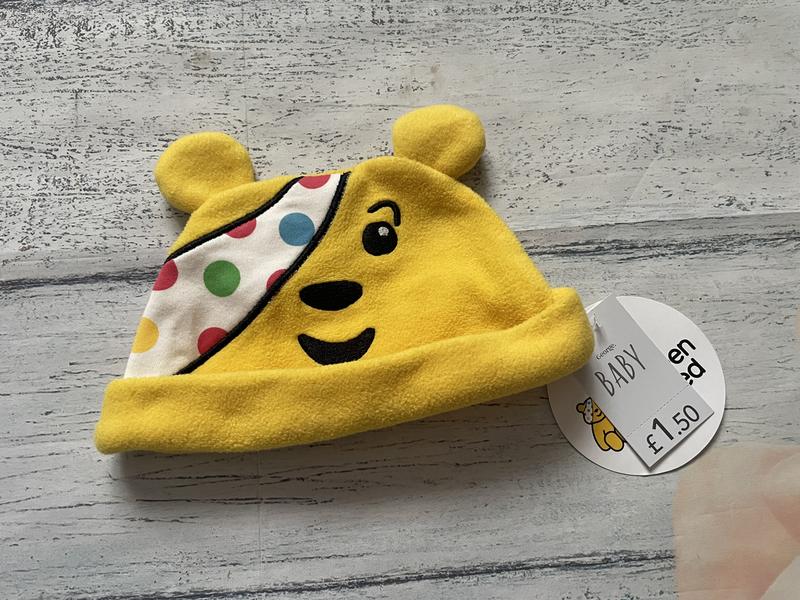 Дитяча шапочка George Pudsey Bear. Деталі про продукт: Назва: Дитяча флісова шапочка Pudsey Bear. Бренд: George (бренд одягу, що продається в ASDA). Персонаж: Pudsey Bear. Розмір: 3-6 місяців. Матеріал: 100% поліестер (фліс). Ціна: На ціннику вказано £1.50. Шапочка має характерний дизайн ведмедика Pudsey з жовтою основою та білою пов'язкою в різнокольоровий горошок.