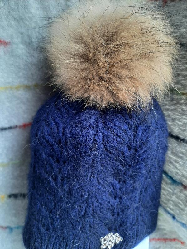 Вязаная двойная шапка темно-синяя на холодную пору.Бубон-енот. Высота -21см ширина -20.