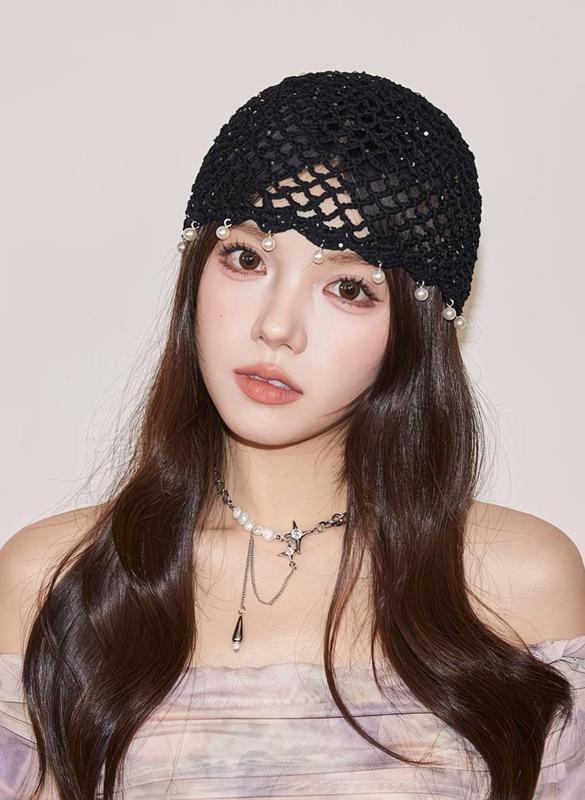 Черная вязаная сетчатая шапка с пайетками и жемчужными подвесками -- модный и оригинальный аксессуар, который добавит изюминку любому образу. Легкая, дышащая и элегантная, она идеально подходит для вечеринок, фотосессий, прогулок и стильных образов в стиле Y2K, ретро или романтический бохо. Украшения из жемчужин создают нежный акцент, а блеск пайеток красиво подчеркивает прическу и макияж. Отличный выбор для девушек, которые хотят выделиться и подчеркнуть индивидуальность
