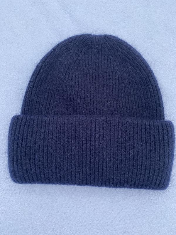 Зимняя теплая и легкая шапка в очень популярном фасоне бини из пуха кролика (30%), акрила (40%) и нейлона (30%), красивого темно-синего цвета, который подойдет ко многим цветам Вашего гардероба. Наличие в составе пуха кролика добавляет нежные серебристые шерстинки, что очень украшают вид шапки, плетена в рубчик, с двойным отворотом, что делает аксессуар теплым в любую погоду. Фасон и цвет шапки делает ее универсальной, она отлично впишется и в женский, и в мужской гардероб. Шапка, конечно, хорошо растягивается, но ориентироваться следует на замеры: ширина - 44 см, высота - 22 см. в нерастянутом виде. По фото видно, что шапочка новая, ее никто не носил.