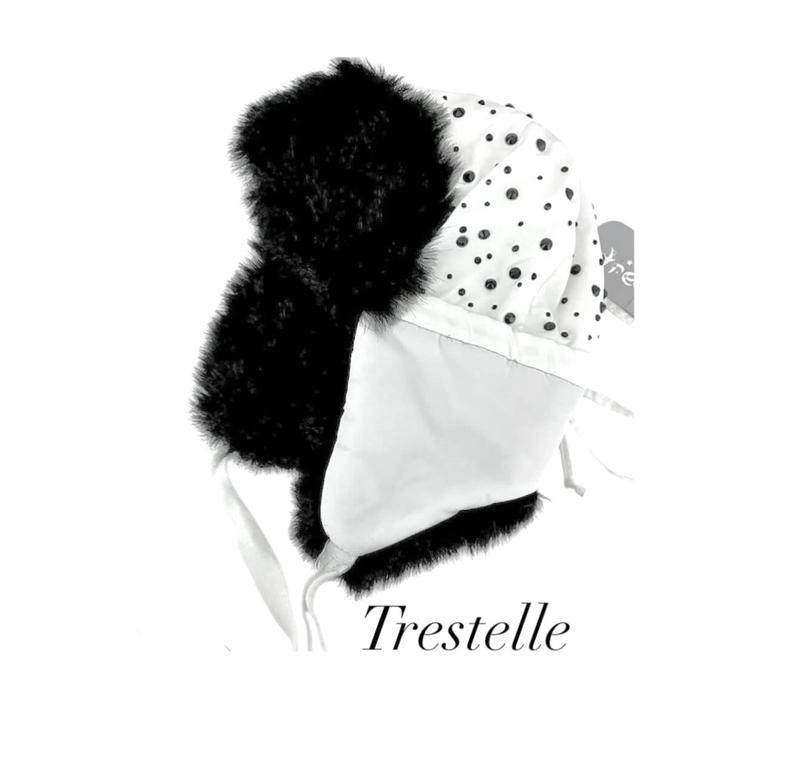 Шапка-вушанка для дівчинки відомого італійського бренду Trestelle в білому кольорі. Шапка оздоблена штучним хутром чорного кольору та декорована кристалами із чорного чеського скла. Шапочка не тягнеться, ширину шапочки можна відрегулювати вбудованим шнурком по всьому периметру шапки і завʼязується ззаду. Модель має розмір 50 см (обʼєм голови). Склад: 100% поліестер