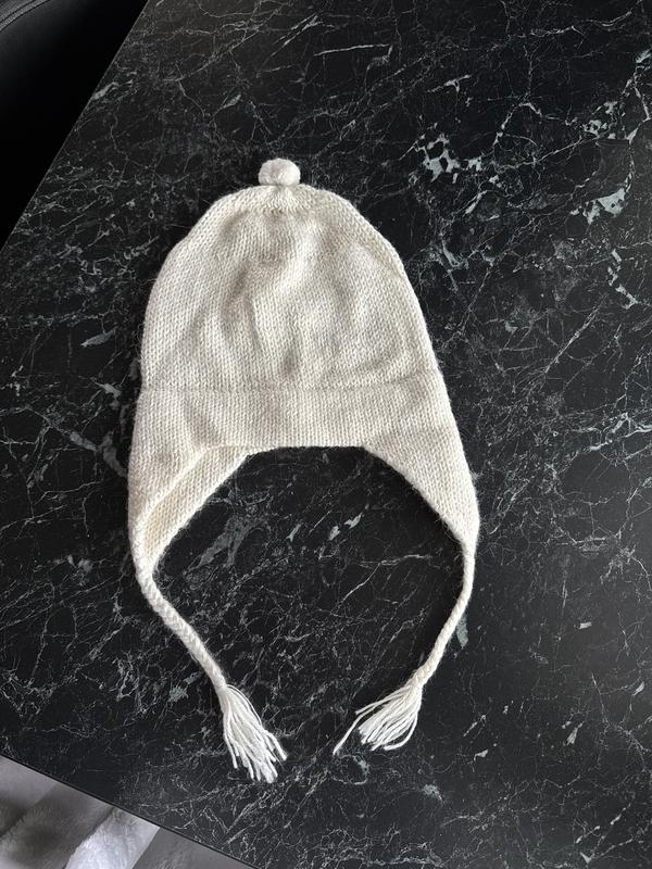 Вязаная шапка-ушанка белого цвета с завязками и помпоном