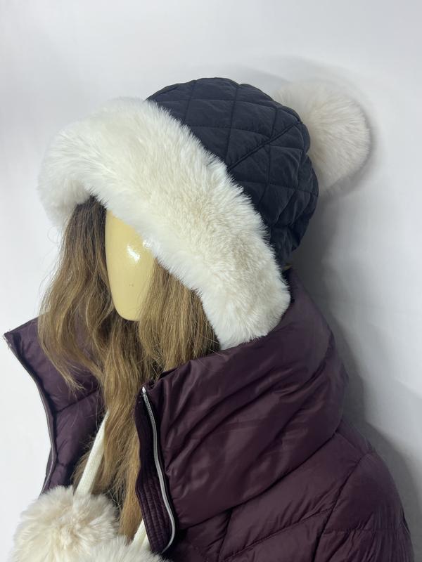 Преміальна зимова шапка з м’якою хутряною опушкою та акцентними помпонами. Стьобана фактура, приємна до тіла, добре тримає тепло та ідеально підходить до пуховика. Комфортна, тепла, стильна – саме те, що потрібно для холодної зими. • стьобаний верх • м’яка опушка • хутро штучне • тепла підкладка • великі помпони • універсальна посадка 🎯 Стан Новий, без дефектів 📏 Розмір Універсальний (підходить на більшість дорослих голів) 🎨 Колір Чорний + молочний хутряний акцент 🌡 Для погоди зима / холодна осінь 💎 Стиль casual, winter street style, преміальний winter look