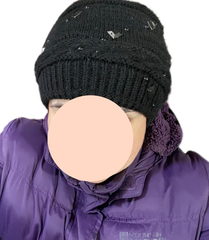 Чорна вʼязана жіноча шапка Двійна, камінці пластикові, приклеєні. Розмір десь 55см Склад: акрил Передоплата або оплата через шафу