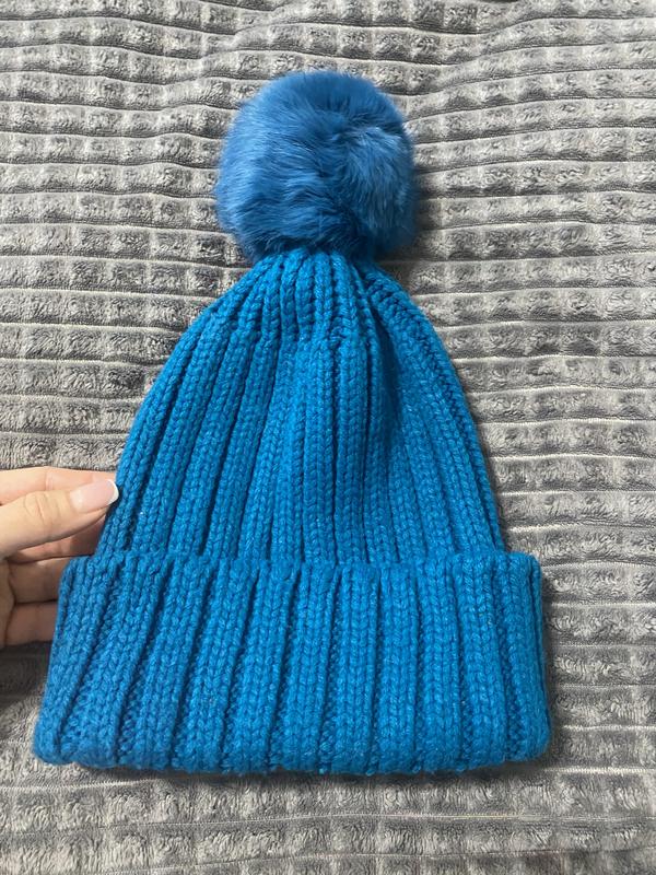 Тепла шапка в’язана бірюзового кольору з бумбоном з кролика, в гарному стані, без дефектів, тягнеться.
