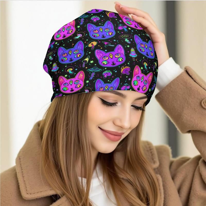 Яскрава оригінальна шапка з космічні котики та гриби Демісезон Унісекс Розмір 26 на 26 см. Чудово тягнеться! Також можна носити з підворотом. М'яка та приємна до тіла. 90% поліестер, 10% спандекс.