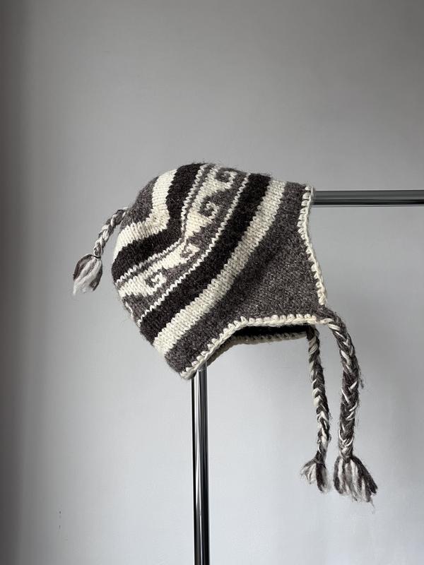 Вінтажна шапка унісекс vintage 80s, nepal wool knit, grey geometrictasseled winter beanie...