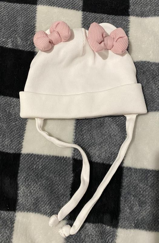 Дитяча шапка з бантиками ,на флісі підійде на весну та осінь ,замовляли ,але не поносили по сезону стала маленька ,розмір 0-6 місяців