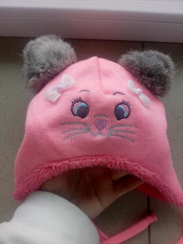 Шапочка для малышки. Размер 42-44. Пойдет на холодную осень, теплую зиму. Помпоны натуральный мех кролика. Подкладка- искусственный мех
