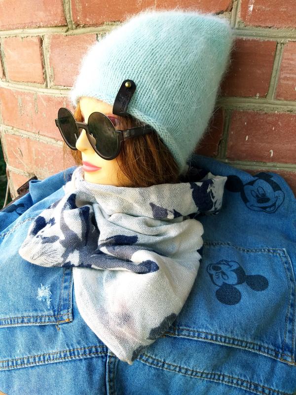Шапочка бини выполнена из ангоры/пуха норки. Цвет нежно-голубой, как айсберг на картинках. Очень красивая и пушистенькая.