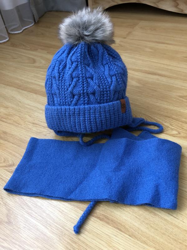 Шапка дитяча з бубоном синього кольору з шарфом.