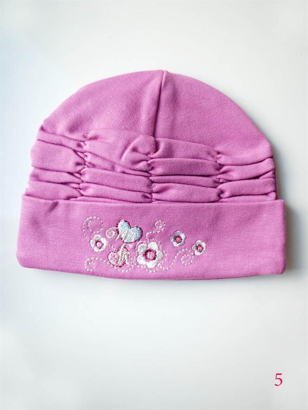 Шапочки трикотажные с отворотом, декоративными сборочками и вышивкой. Хорошо растягиваются, плотно облегают голову. Cостав: 97,8% хлопок, эластан 2,2% Размеры: 44-46 (с 1 по 6 номер), 46-48 (с 8 по 10 номер) Цвета в ассортименте. Производство: Польша Размер 3 соответствует объему 44-46 (фото с номерами с 1 по 6) Размер 4 соответствует объему 46-48 (фото с номерами с 8 по 10)