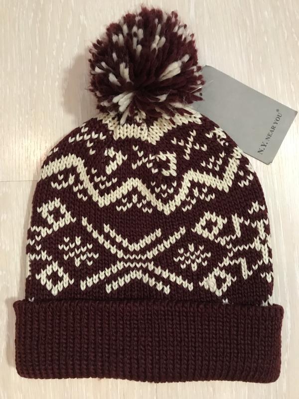 Предлагаю вашему вниманию очень красивую и стильную вязаную тёплую шапочку бордового цвета в светлых узорах (в живую смотрится гораздо интересней). Фирма N.Y. NEAR YOU. Сосав отсутствует..нитка мягкая и приятная на ощупь. Длина без бубона-22 см, длина с бубоном-28см, ширина-22 см+ещё хорошо тянется. Новая. Внимание!!! При покупке три и более моих любых вещей-бесплатная доставка посылки Новой почтой. Удачных покупок.