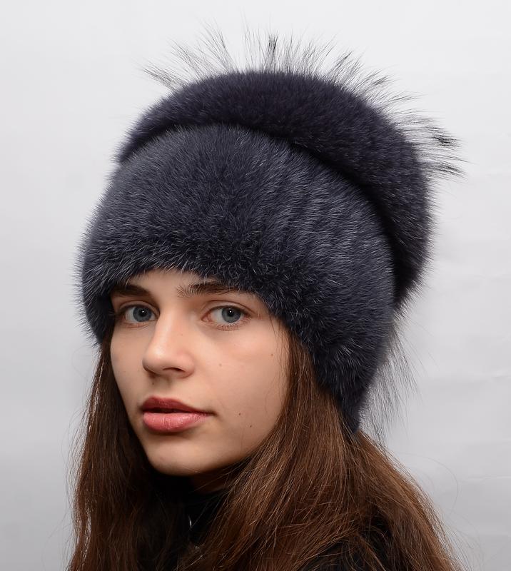 Женская зимняя норковая шапка на вязаной основе "Улитка", размер: универсальный, цвет: Баклажанный, помпон: песец, модель выполнена из меха вязаной норки с украшением в виде помпона и пряжкой со стразами или бусами и мехом чернобурки, цветовая гамма составляет более 15 видов цвета, уточнять в лс