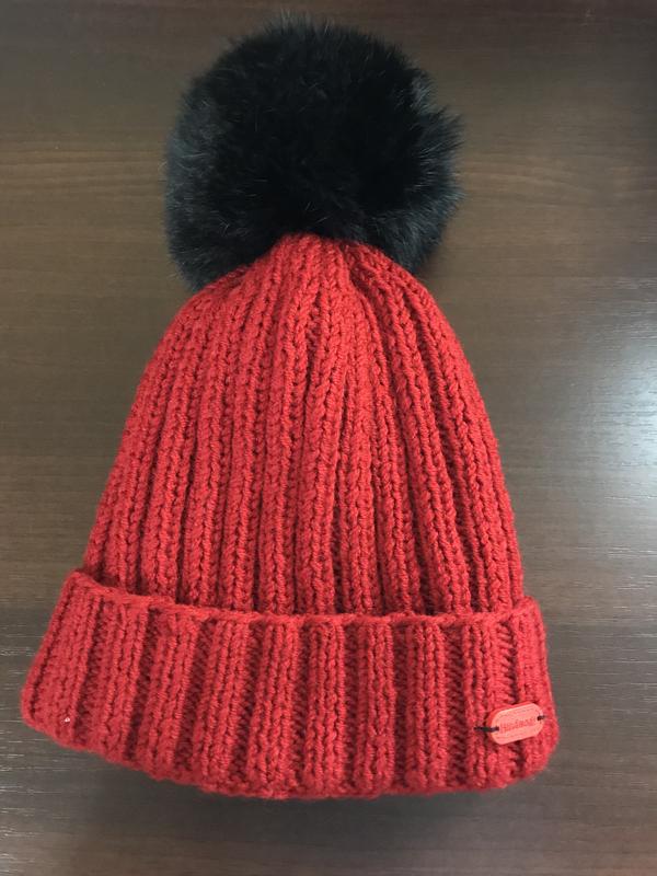 Зимняя шапка на флисе с натуральным помпоном,ручная вязка.