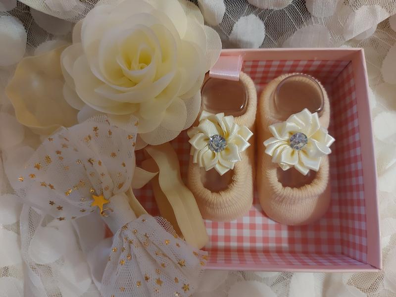 Шикарный набор для новорожденной девочки в подарочной упаковке! Прекрасно подходит для выписки из роддома или на подарок. Родители ребенка будут счастливы получить такой красивый набор. Также этот набор подойдет для первых фотографий, малышка будет смотреться просто изумительно, как маленькая принцесса. В набор входит 3 предмета: пинетки из хлопка и 2 повязки на голову. Все изделия декорированы кружевом и батником Размер стельки: 9 см