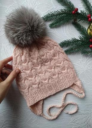 Пудрова шапочка із ніжним пухнастим помпоном. На завязочках, утеплена флісом, прекрасний натуральний помпон