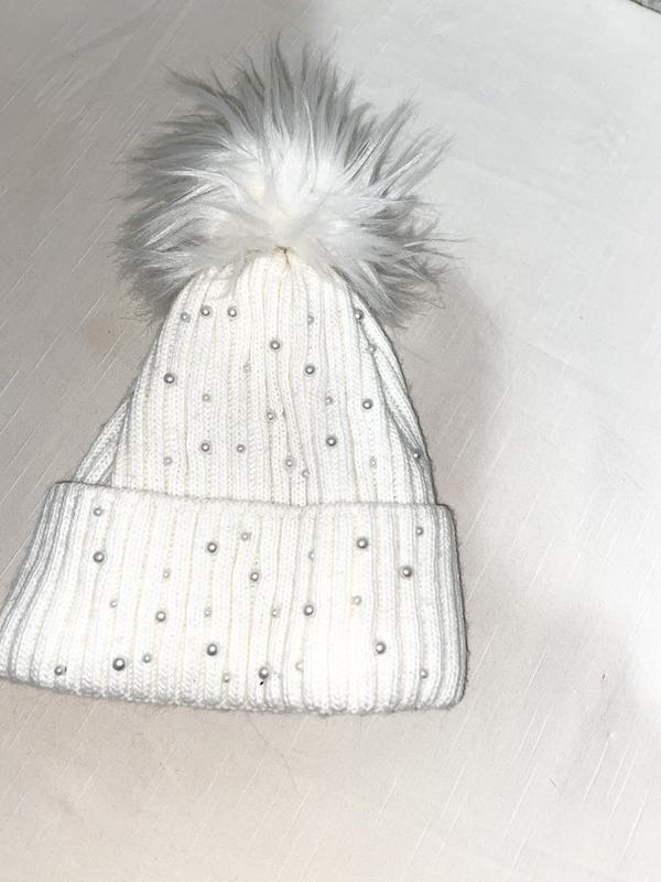 Стильна тепла білосніжна шапка з намистинками бусінами з помпоном. Розмір 55. Стан ідеал нової. Хутро штучне. Дивіться інші оголошення, речі від 20 грн.