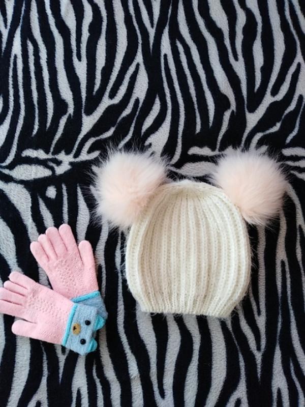 Шапка дитяча для дівчинки.Тепла,в'язка плотна.Заміри на фото.Рукавички в подарунок))))Розмір не вказаний,але по факту до 7років буде ок.Шапка молочного кольору,бамбони-ніжного персикового кольору...в'язка дуже добре тягнеться.