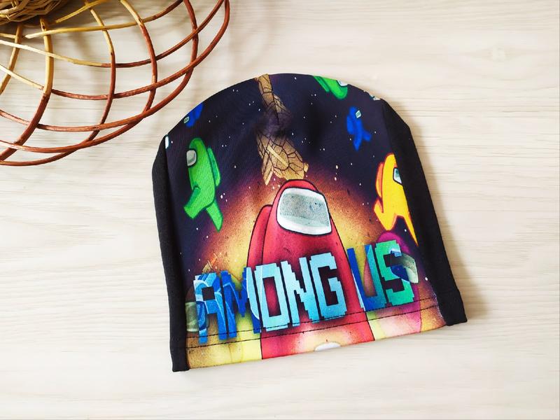 150грн трикотажна шапочка Among Us тоненька одинарна вік 5-7 років на обєм 52-54см тягнеться гарно замір 21*21см