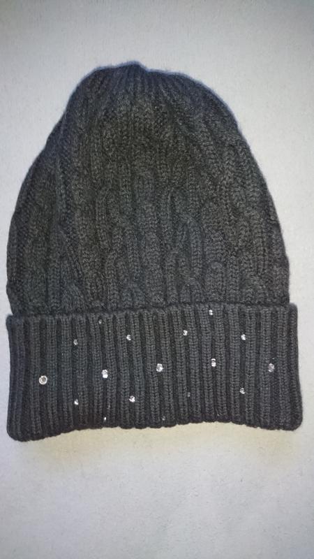 Черная шапка облегченная, однослойная, на отвороте стразы.Состав : 60% шерсть, 40 акрил, в состоянии новой.