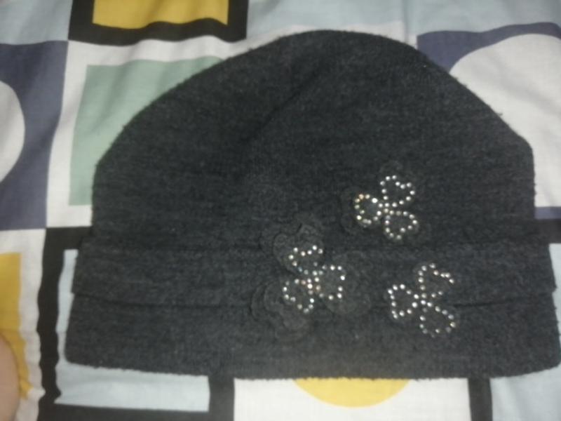 Жіноча шапка на весну і осінь. Заміри півобхват головы 25см(+-1см). Тому загальний обєм 50см.(+-1см).Тягнеться. Квіточки приклеєні.