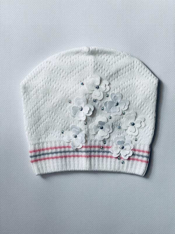 Детская белая демисезонная шапка для девочки с цветами и стразами