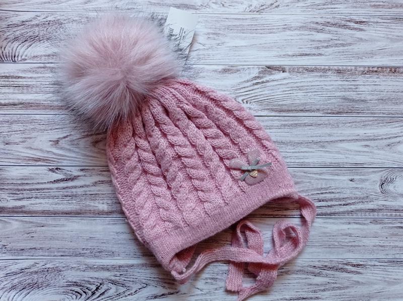 Теплая вязаная шапочка на завязках с пышным помпоном. Помпон из искусственного меха. Внутри утеплена флисом. ◾Размер 48-50. ◾Возраст 2-3 года ◾Цвет пудра меланж. Приглашаю к другим объявлениям ❤️