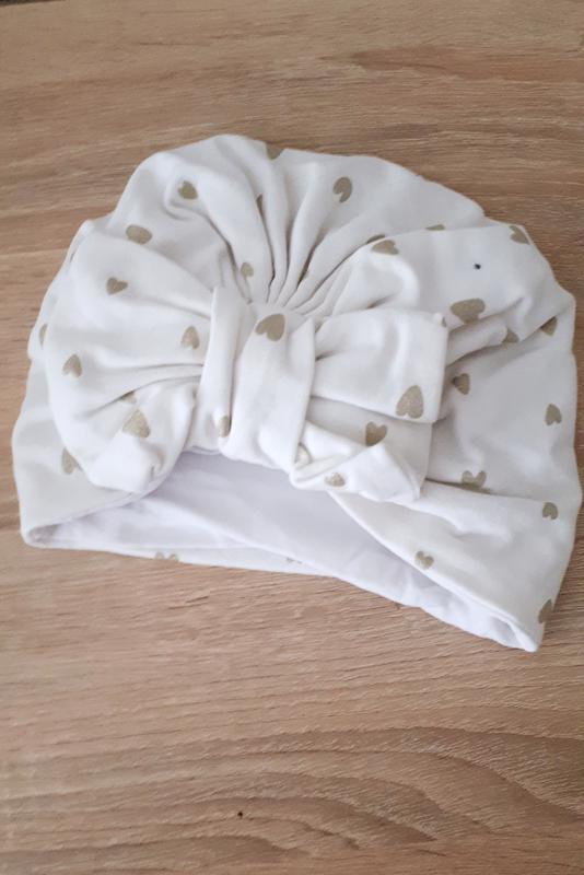 Хлопковая, трикотажная демисезонная шапачка для девочки с узором золотые сердечки