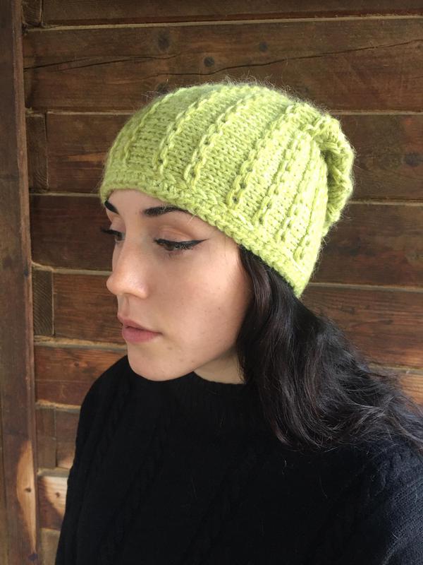 Шапочка бини ручной работы,сязана из двух ниточек:итальянского мохера и хлопка,цвет-салатовый.На объем головы 54-56.Длина шапочки-27см.