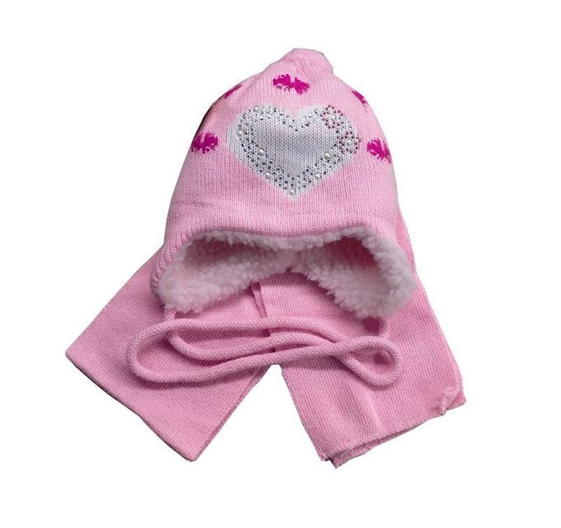 Возраст - от рождения до 3 месяцев. Глубина шапки 15 см, ширина изделия (в нерастянутом виде) 17 см. Шарф - длина 80 см, ширина 11 см . Состав 98% хлопок, 2 % лайкра, подкладка - 100% акрил Детский комплект шапка и шарф для малышки - нарядный, теплый и удобный. Шапочка утепленная на меху на мягких завязках с бубоном украшена сердечком, мягкий и уютный шарф. .