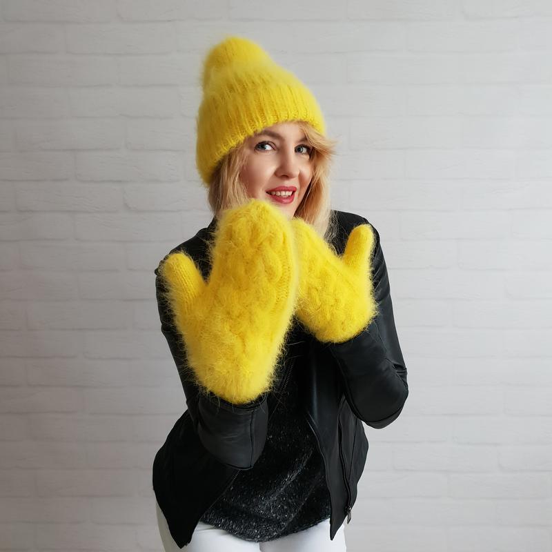 Вязаная теплая зимняя шапка . Очень пушистая.Не колет! Шапка с одним отворотом ( размер 55-56см). Связана из пуха норки( кролик). Ручная работа. Цвет желтый. Из-за разных настроек экранов телефона цвета могут передаваться не на все 100% верно.