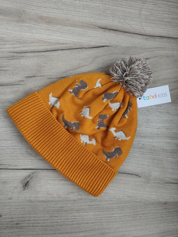 Теплая вязаная шапка с динозаврами на мальчика, по бирке 48-50, будет примерно на 2-5 лет. Цвет шапки горчичный, цвет помпона может отличаться от того что на фото. Шапочка подшита флисом. Состав: 50%-шерсть, 50%-ПАН. Подкладка-термофлис.
