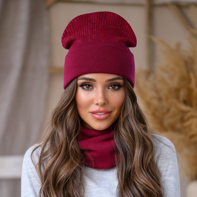 Шапка-бини, двойная. Украшена стразами. Снуд-баф очень приятный на ощупь и универсален в использовании. Состав: 50% акрил, 50% шерсть.