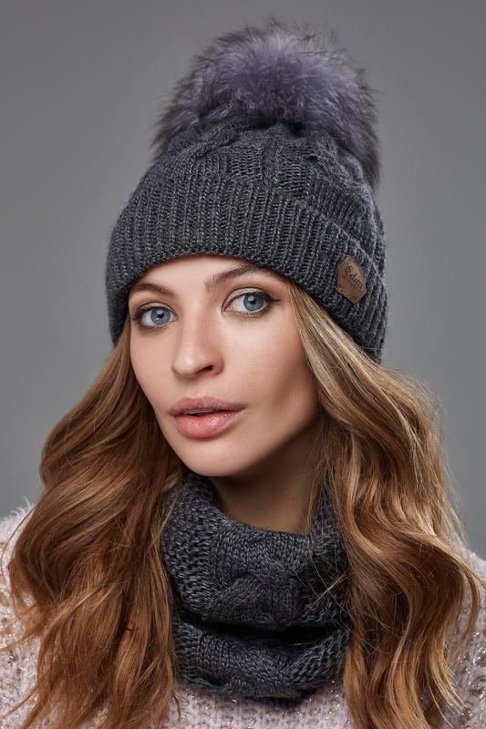 Шапка с помпоном из чернобурки+хомут "клэр" - 9019 графит