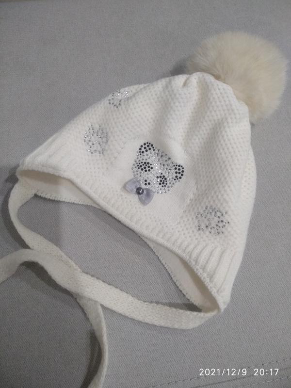 Шапочка для дівчинки, вовна + акрил, флісова підкладка, бумбон з натурального хутра. Шапочка м'якенька, приємна на дотик і дуже тепла. Півоб'єм в неростягнуьому вигляді 26 см. Стан ідеальний!