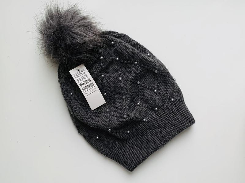 Шапка с пушистым помпоном, декорированная жемчужными бусинами