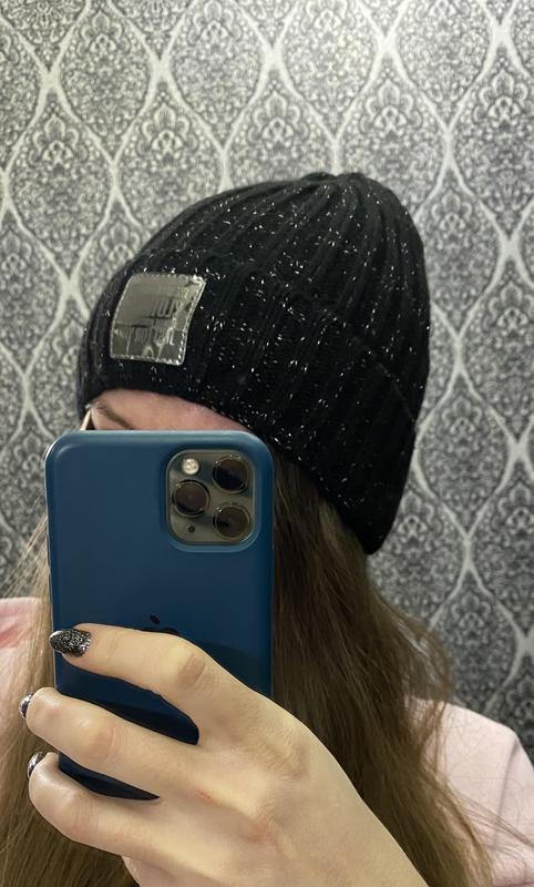 Очень тёплая шапка чёрного цвета с добавлением люрексовой нити, в средине флисовая подкладка. Отличное качество