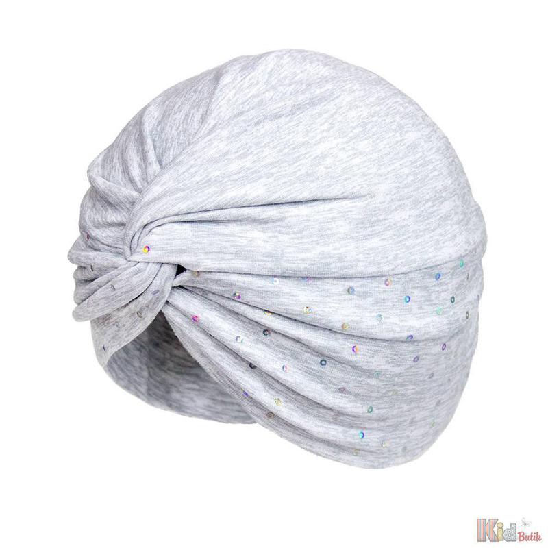 Приймаємо оплату карткою "Пакунок малюка". Легкая шапка-чалма серого цвета для девочки. Пошита из натурального, приятного к телу трикотажа. Украшена маленькими паетками. Отлично дополнит и повседневный, и более праздничный образ.